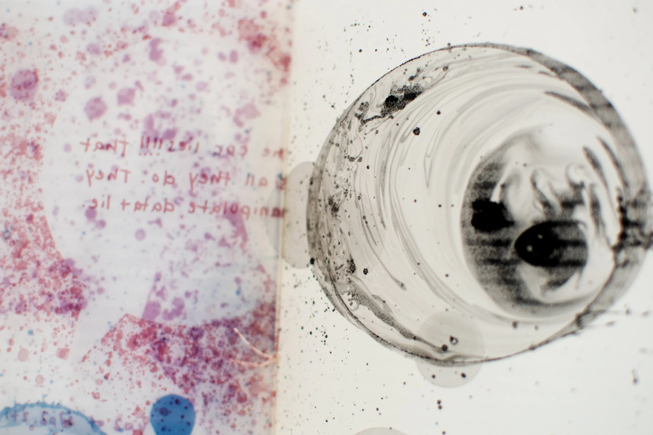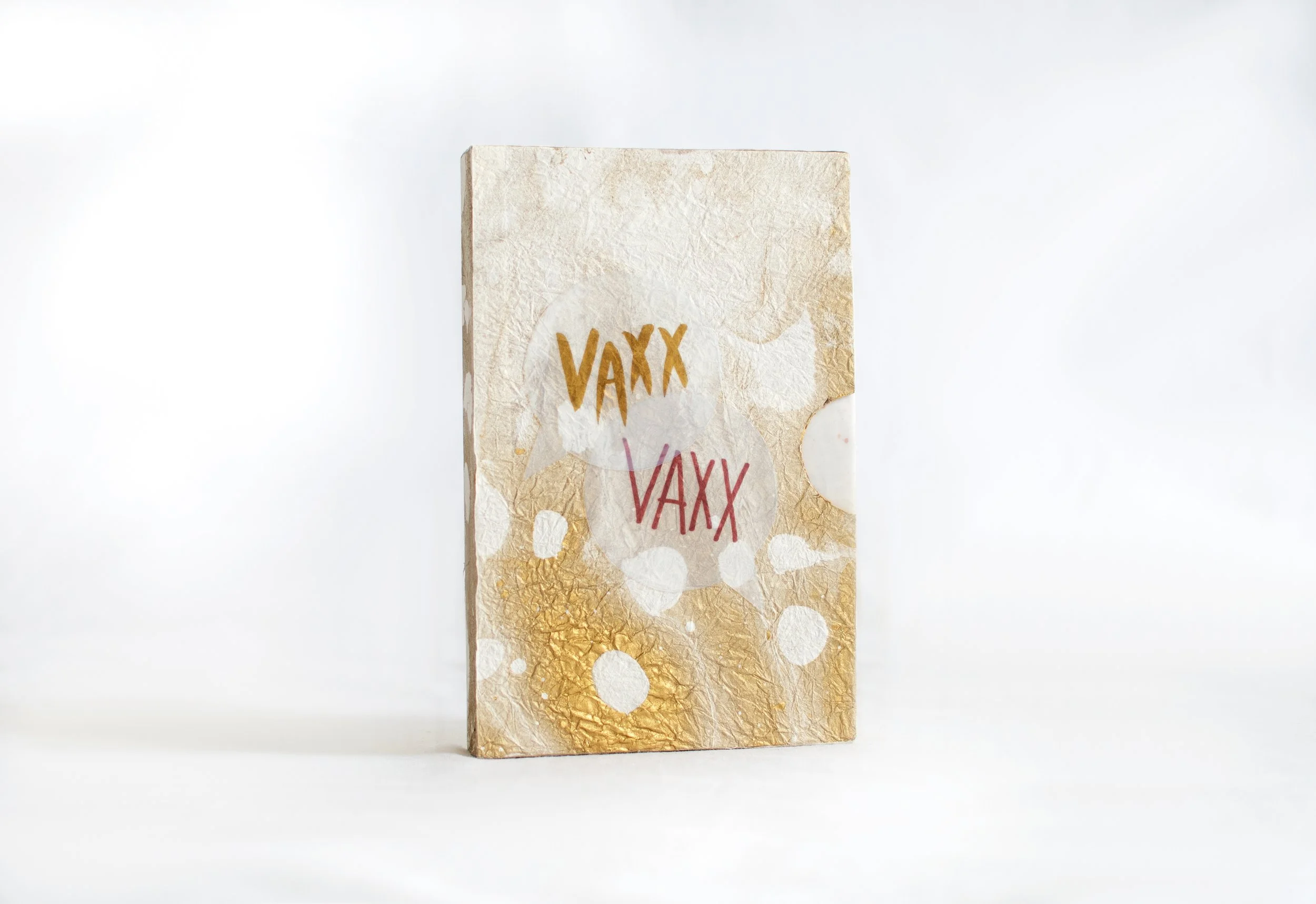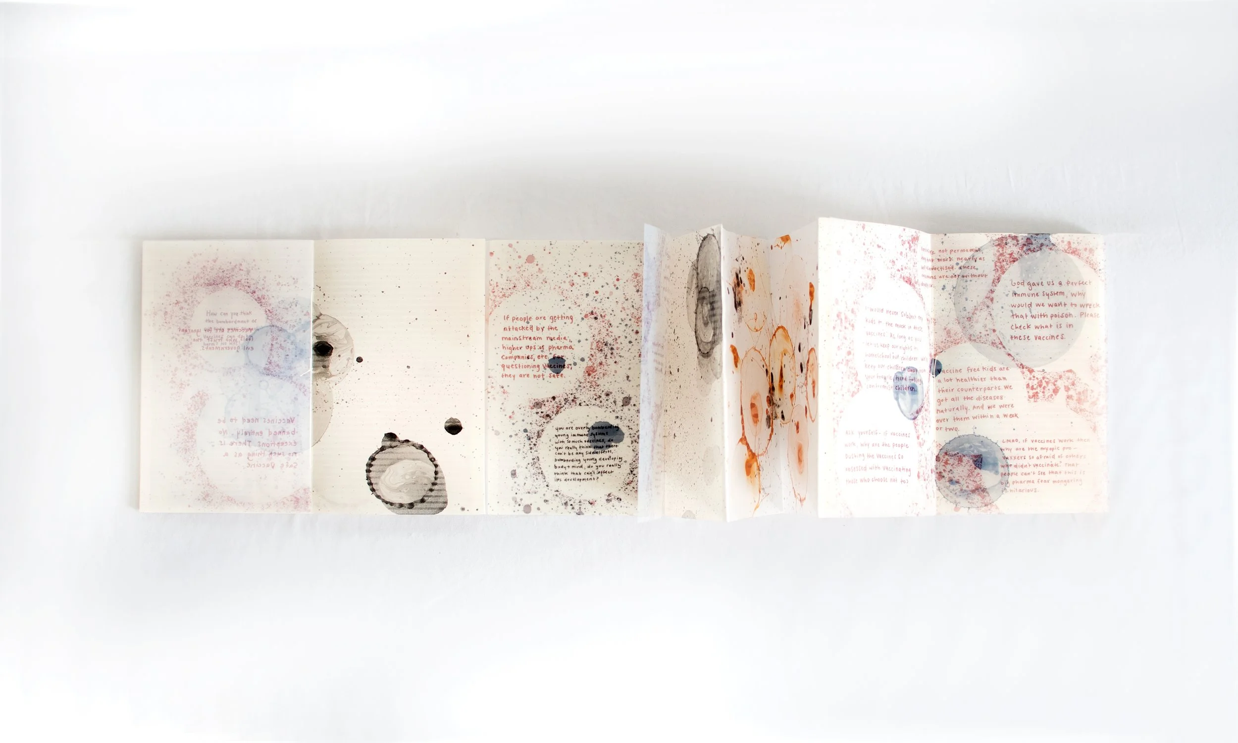 VAXX is a handmade book designed to explore the bitter divide between pro- and anti-vaccine groups. The book is a conversation between the two sides, represented by different colors and handwriting, and can be read in either direction. The backdrop of each page is an array of circles created by blowing bubbles of ink and pigment.