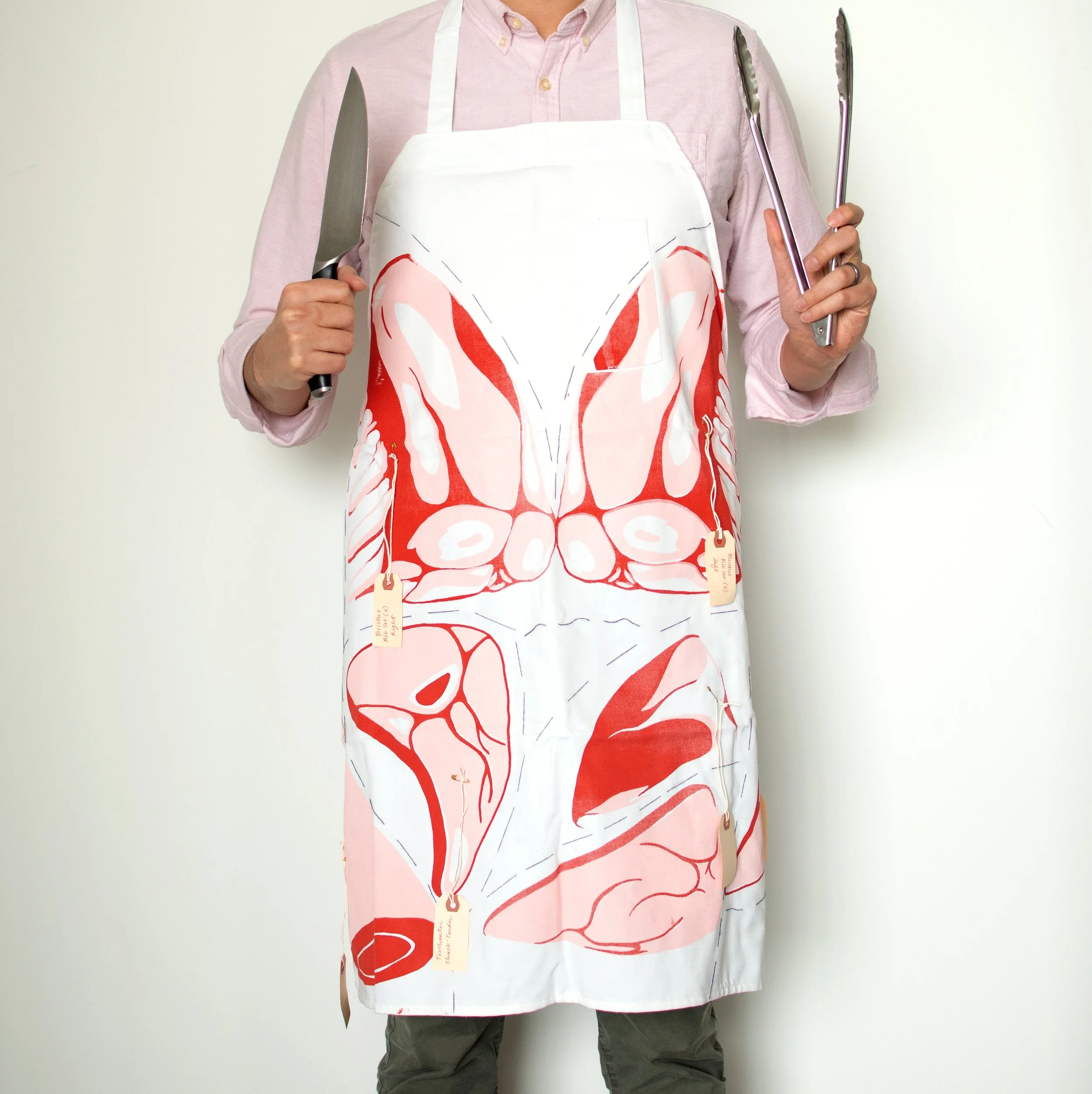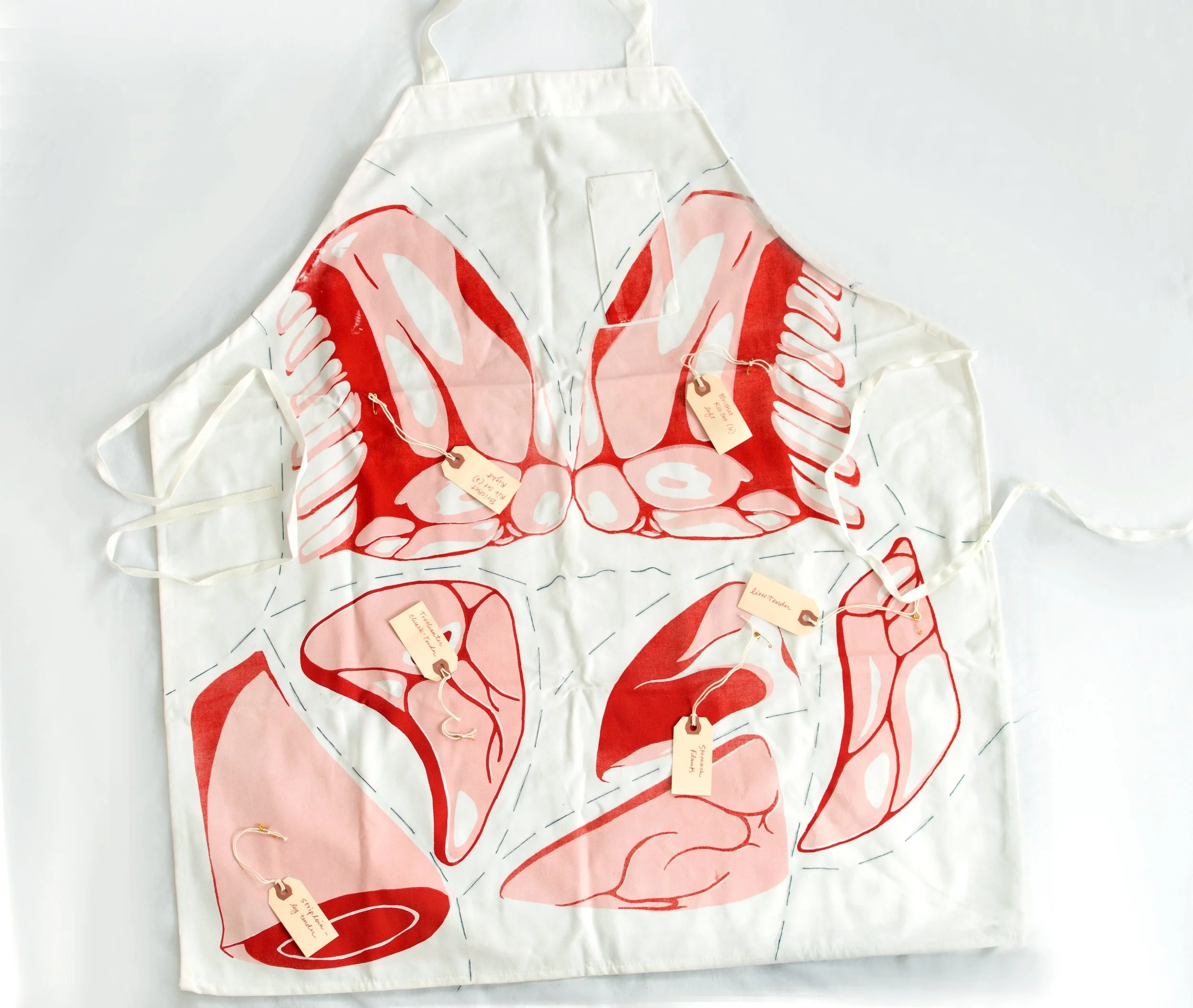 This is a screen printed book and atlas of cuts of meat that opens up into a stylish apron.